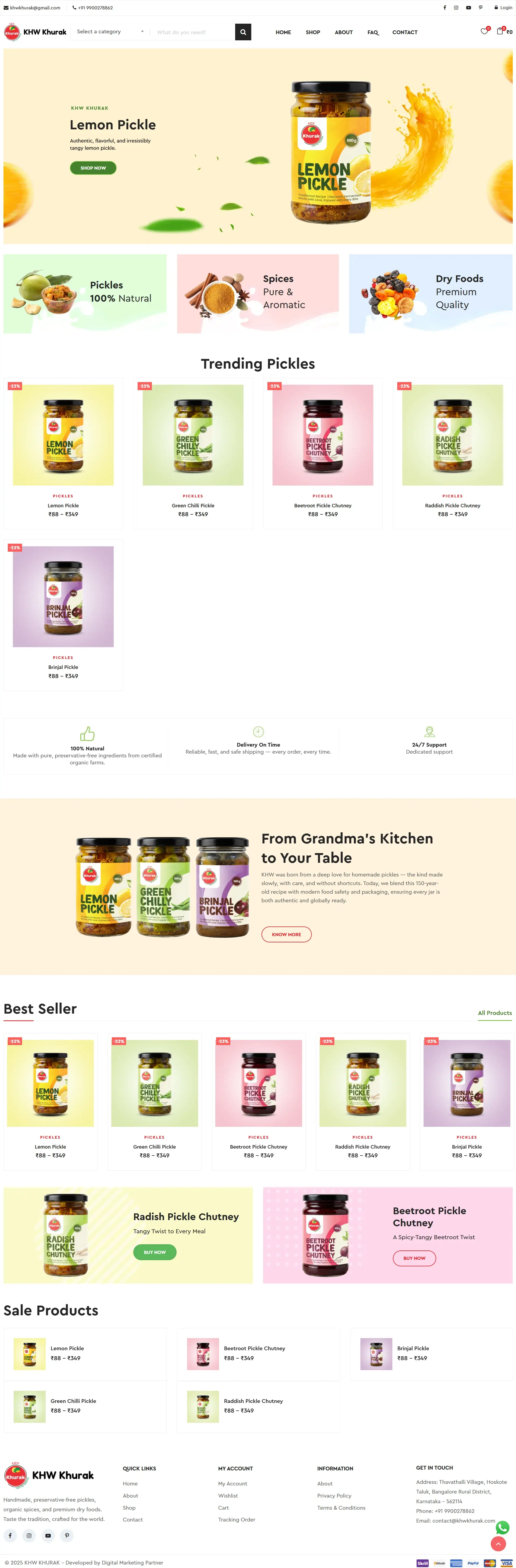 To expand its digital presence and make its products easily accessible to customers across India, KHW Khurak worked with Digital Marketing Partner to design a responsive, visually appealing food & spices website. The platform showcases product categories such as pickles, masalas, chutneys, and dry snacks, while offering e-commerce functionality, recipe inspiration, and nutritional information, making it easier for consumers to explore and purchase.